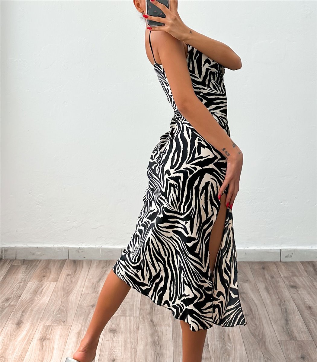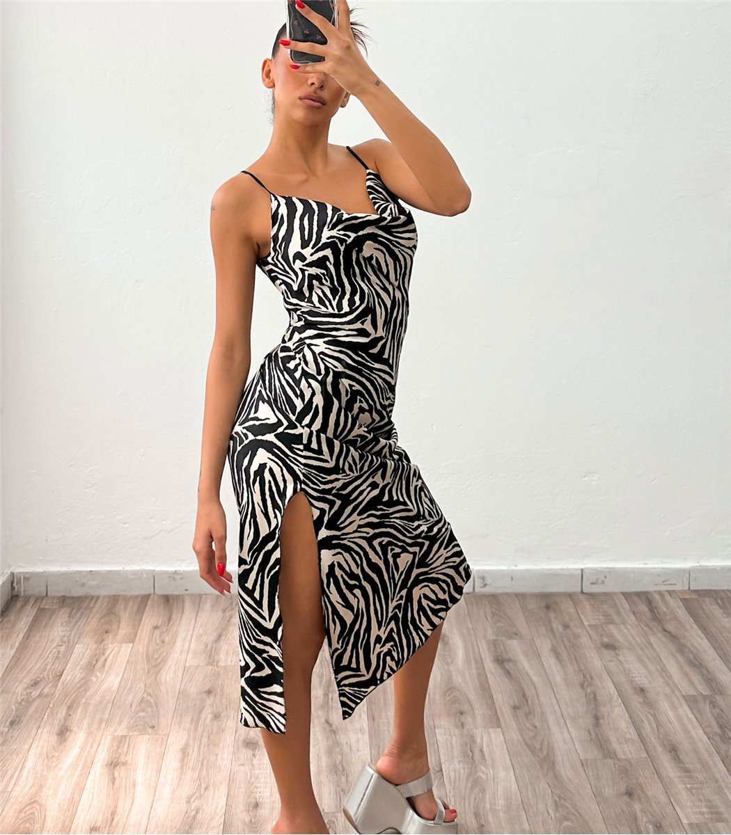 Φόρεμα μάξι σατέν τιράντα με τύπωμα ζέβρα και άνοιγμα στο πλάι. Σταθερό ύφασμα. Antonella