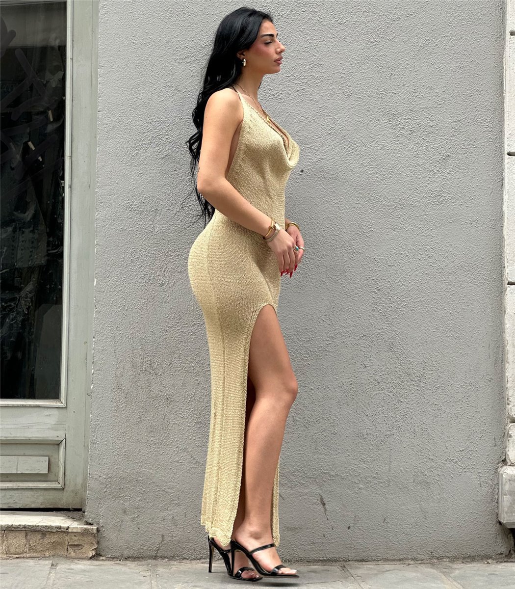 Χρυσό φόρεμα maxi πλεκτό ντραπέ στο στήθος και ανοικτή πλάτη. Έχει σχίσιμο μπροστά στο ενα πόδι. Claudina