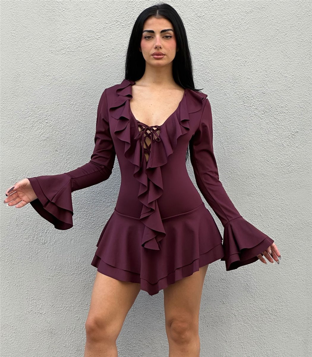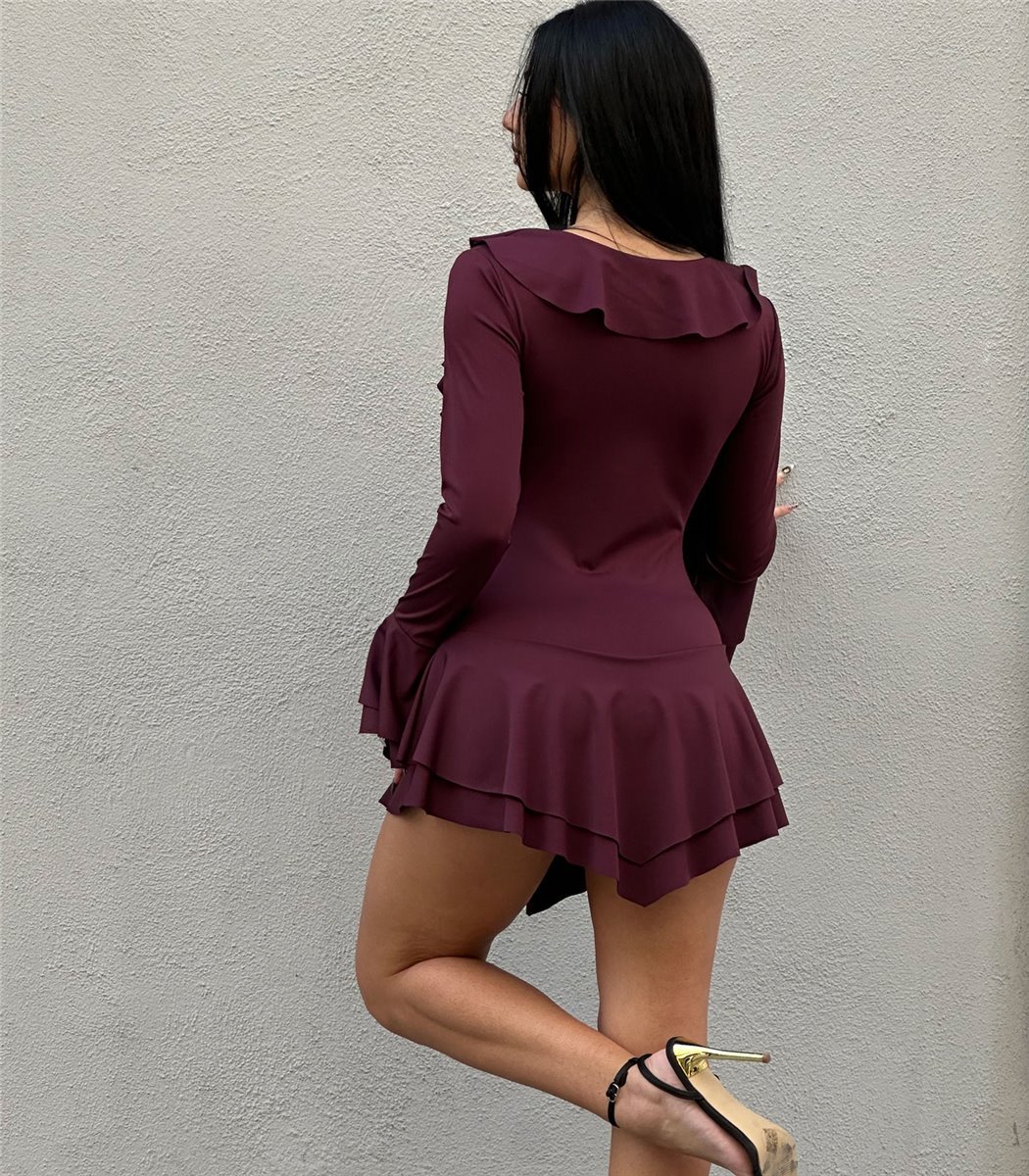 Μπορντό κοντό φόρεμα Kelly. Είναι μακρυμάνικο με χιαστή δέσιμο στο στήθος. Έχει φραμπαλά μπροστά και στο κάτω μέρος. Εσωτερικά έχει σορτς. Το ύφασμα είναι σφικτό μαλακό με ελαστικότητα.