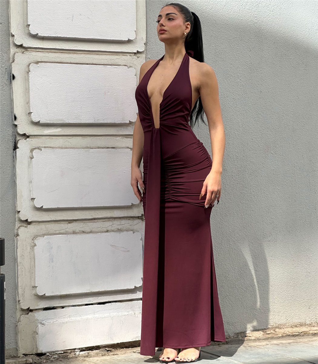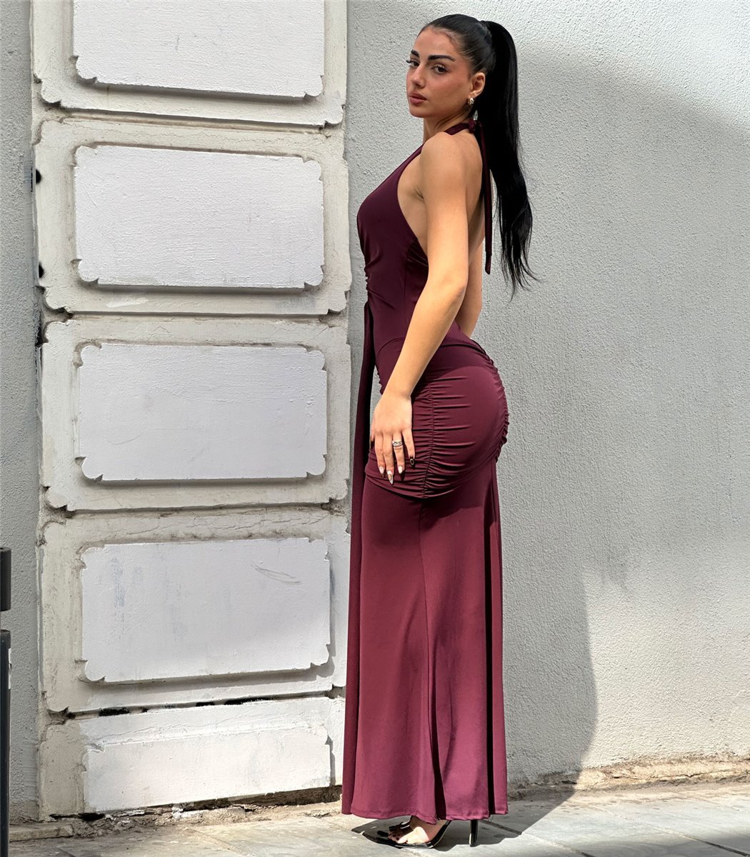 Μπορντό ελαστικό μάξι φόρεμα με ανοικτό ντεκολτέ και ανοικτή πλάτη. Δένει λαιμό και έχει σούρες μπροστά στο άνοιγμα και γύρω - γύρω στο ύψος της περιφέρειας. Lillian