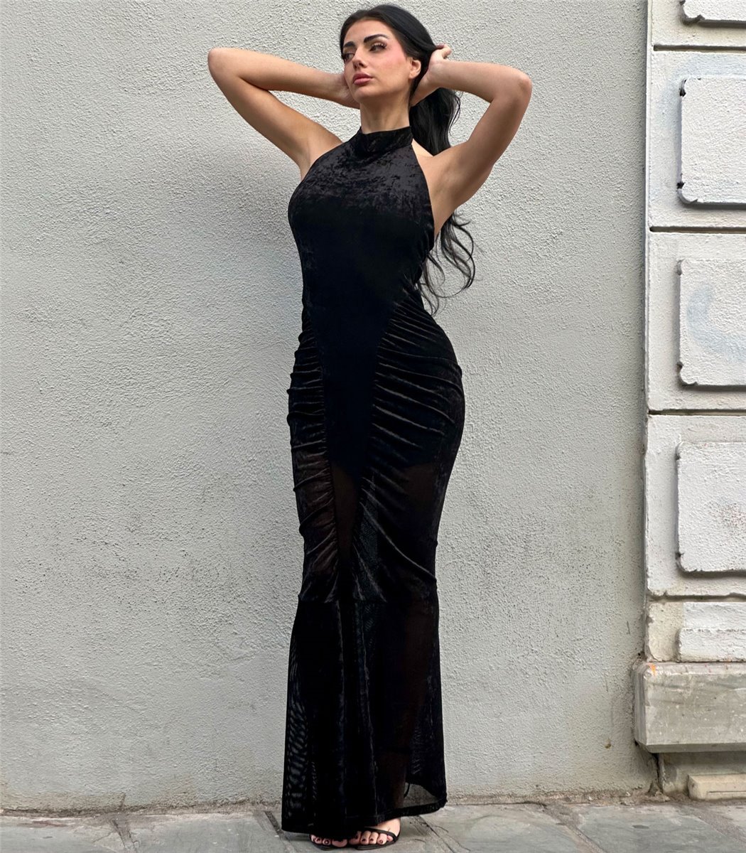 Μαύρο ελαστικό μάξι φόρεμα σε ύφασμα τσαλακωτό βελούδο. Δένει λαιμό και έχει σούρες στα πλάγια. Phoebe