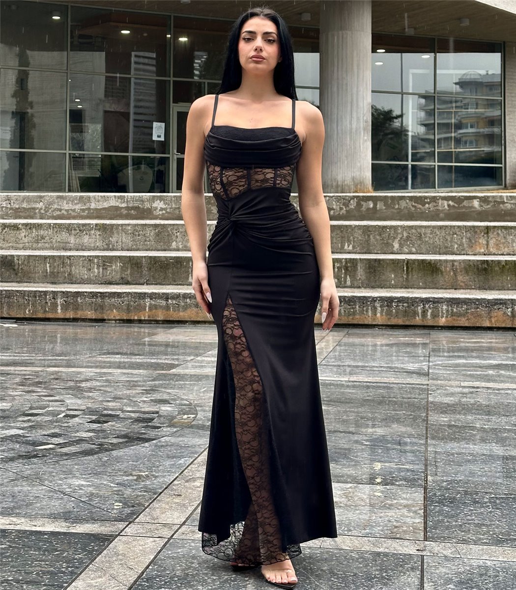 Μαύρο φόρεμα με δαντέλα Esther. Έχει καπς στο στήθος και έξτρα ύφασμα που κάνει ντραπέ. Στην περιοχή της μέσης κάνει σχέδιο κόμπο απο το ίδιο ύφασμα και έχει άνοιγμα που φαίνετε το πόδι λόγω της δαντέλας. Τα ραντάκια στους ώμους είναι ρυθμιζόμενα και πίσω στο κέντρο πλάτης έχει κρυφό φερμουάρ. Το ύφασμα είναι ελαστικό.