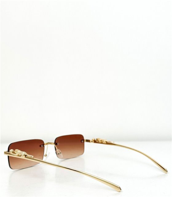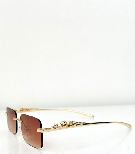 Καφέ τετράγωνα γυαλιά ηλίου με χρυσή τίγρη στο πλάι και μεταλλικό σκελετό.