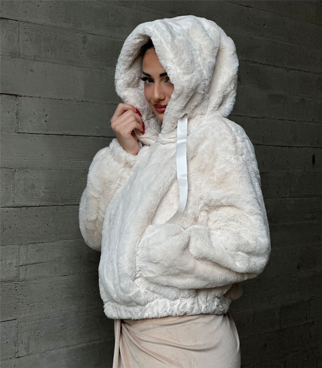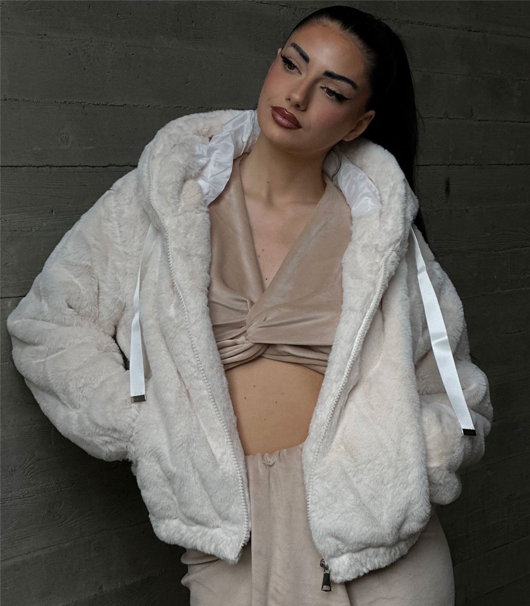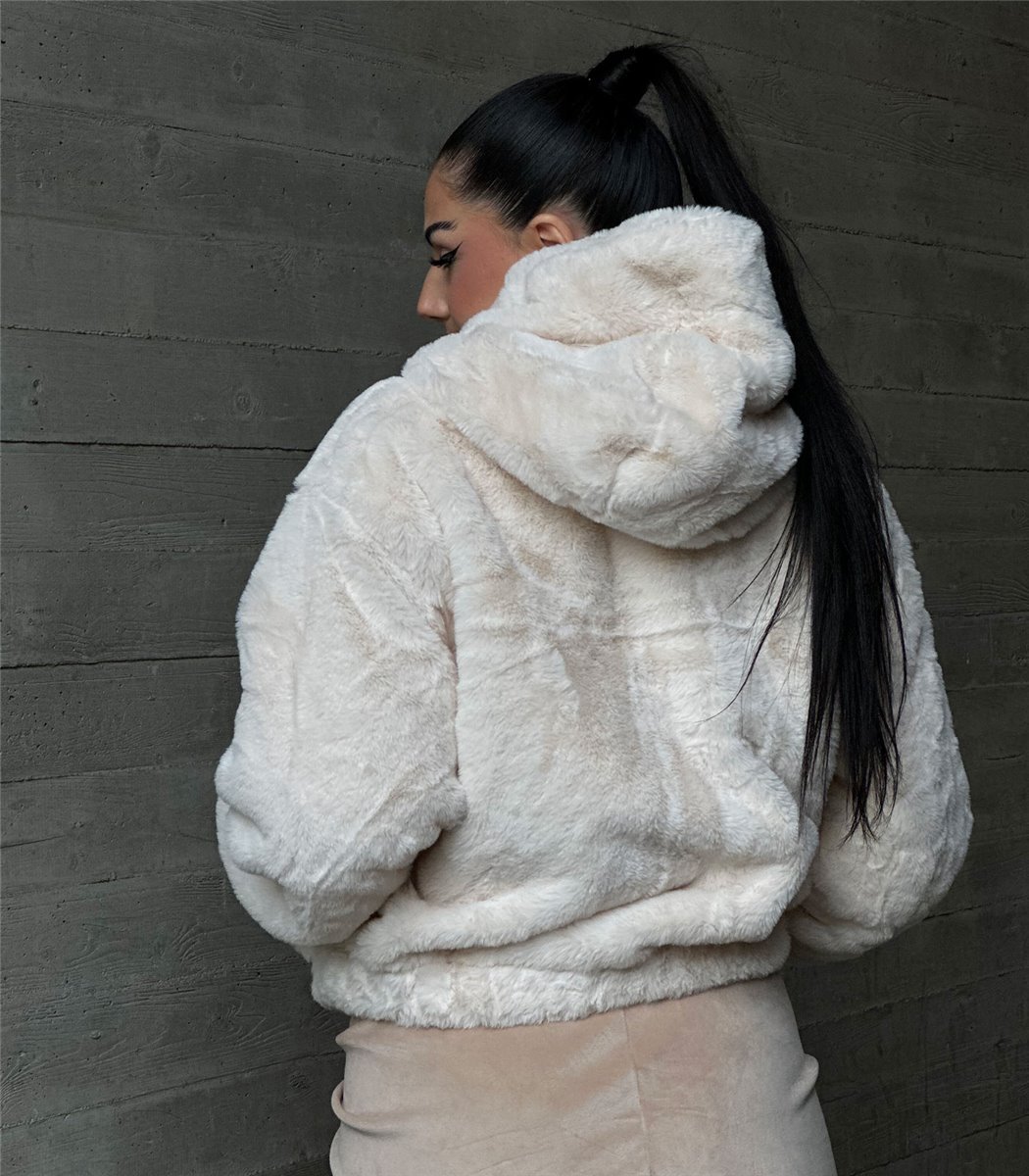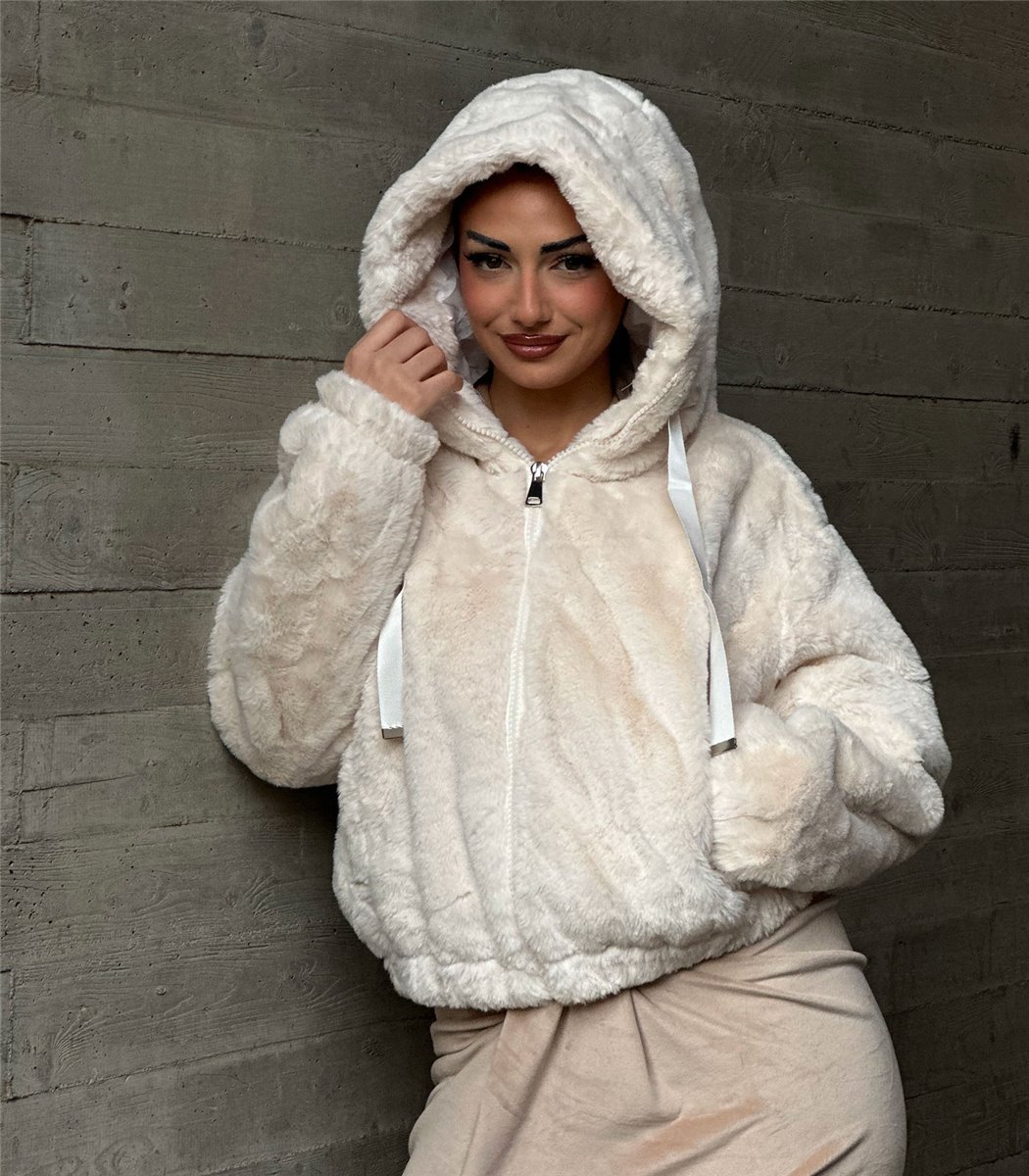 Εκρού συνθετική γούνα κοντή με κουκούλα και φερμουάρ με εσωτερική φόδρα. Έχει τσέπες μπροστά. Gianna