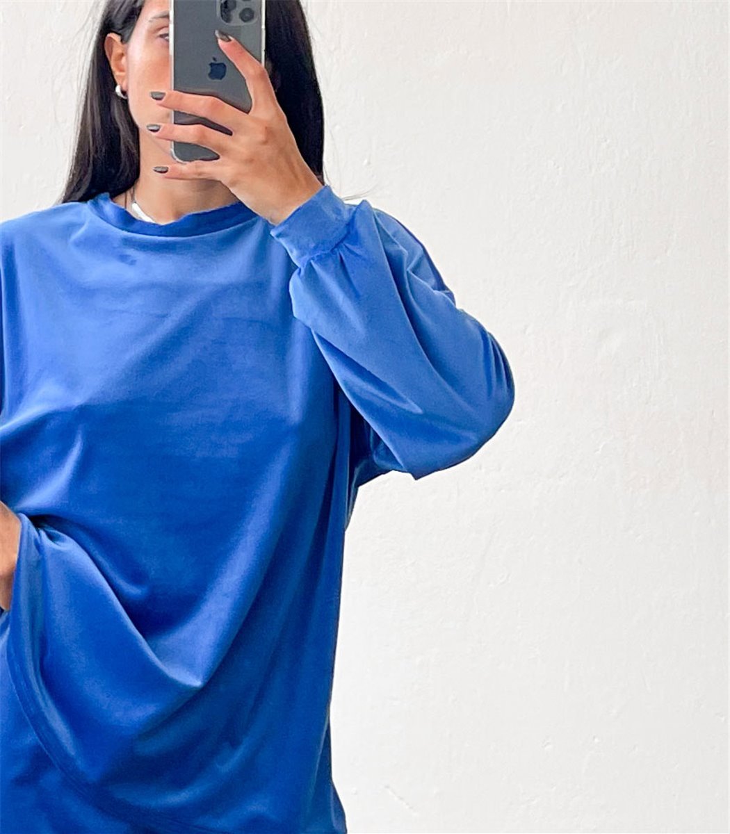 Μπλε σετ μπλούζα μακρυμάνικη. Ψηλόμεσο παντελόνι βελούδο με λάστιχο. Μικρή ελαστικότητα.