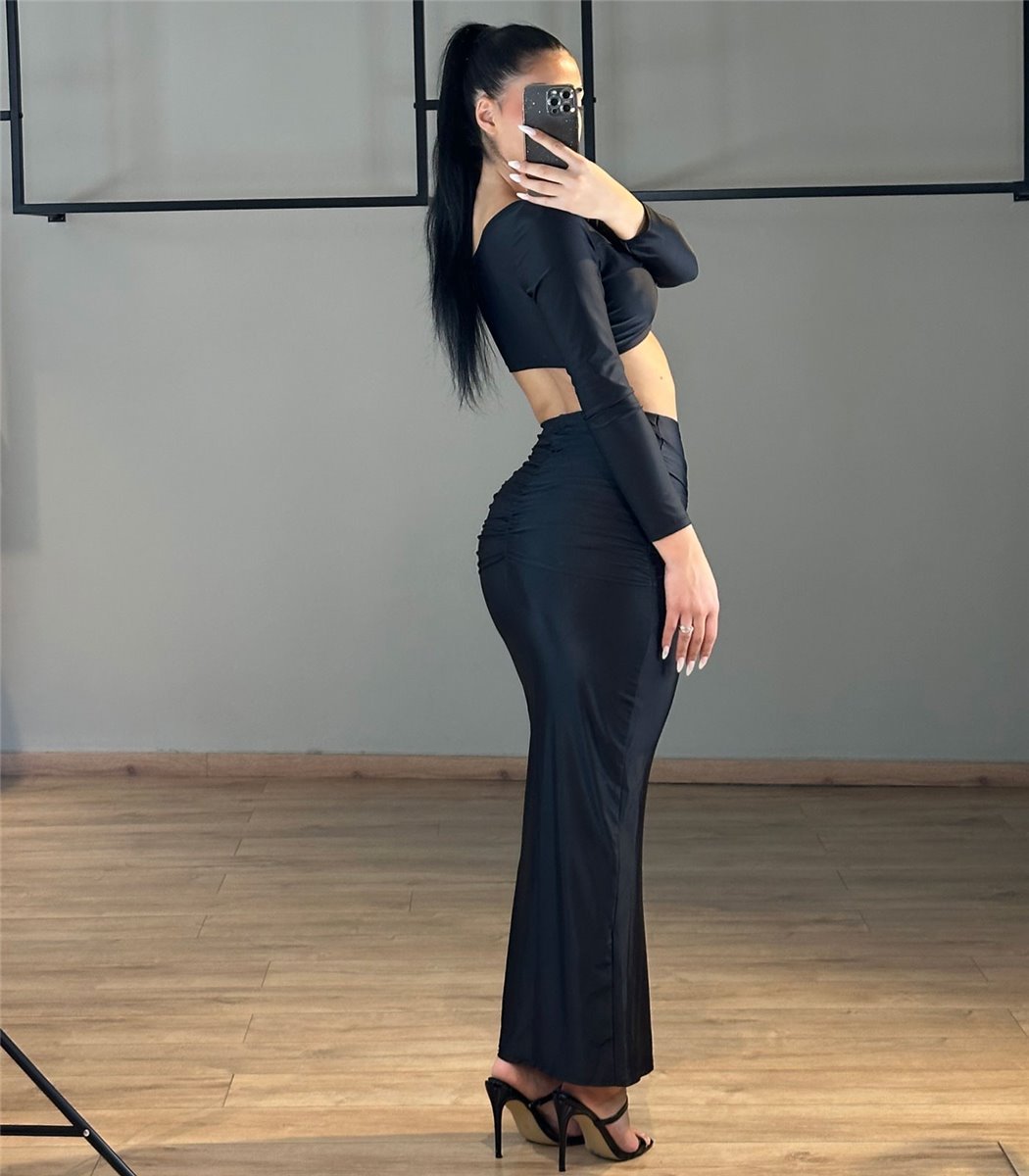 Μαύρο σετ με μπλούζα χαμόγελο, καπς στο στήθος και τρυσή τόκα. Η φούστα είναι ψηλόμεση με χρυσή τόκα μπροστά και έχει σούρες στα πλαινα και πισω στο κέντρο της περιφέρειας. Στο κέντρο πίσω χαμηλά εχει σχίσιμο. Το ύφασμα είναι ελαστικό γυαλιστερό. Arabella