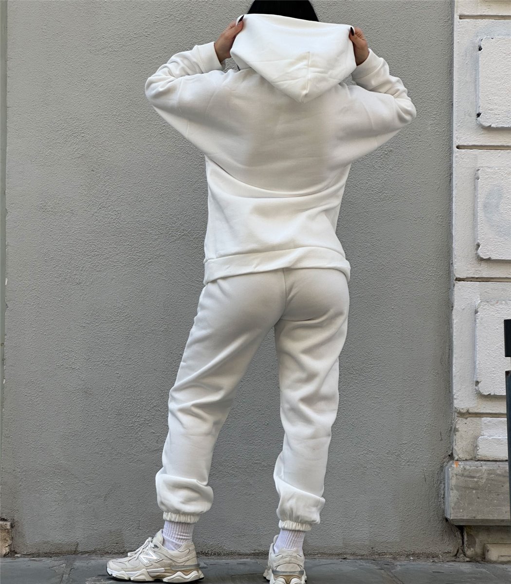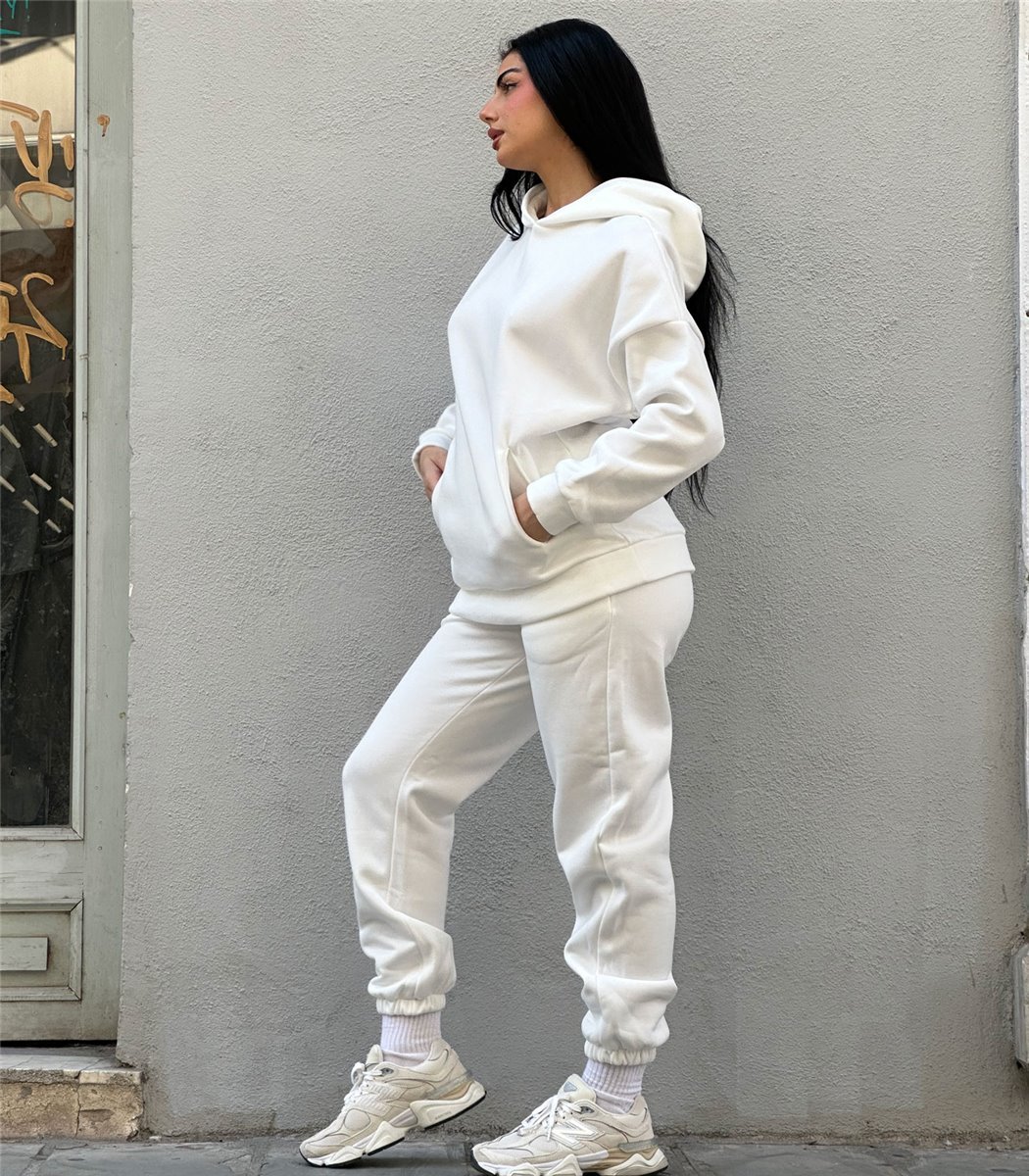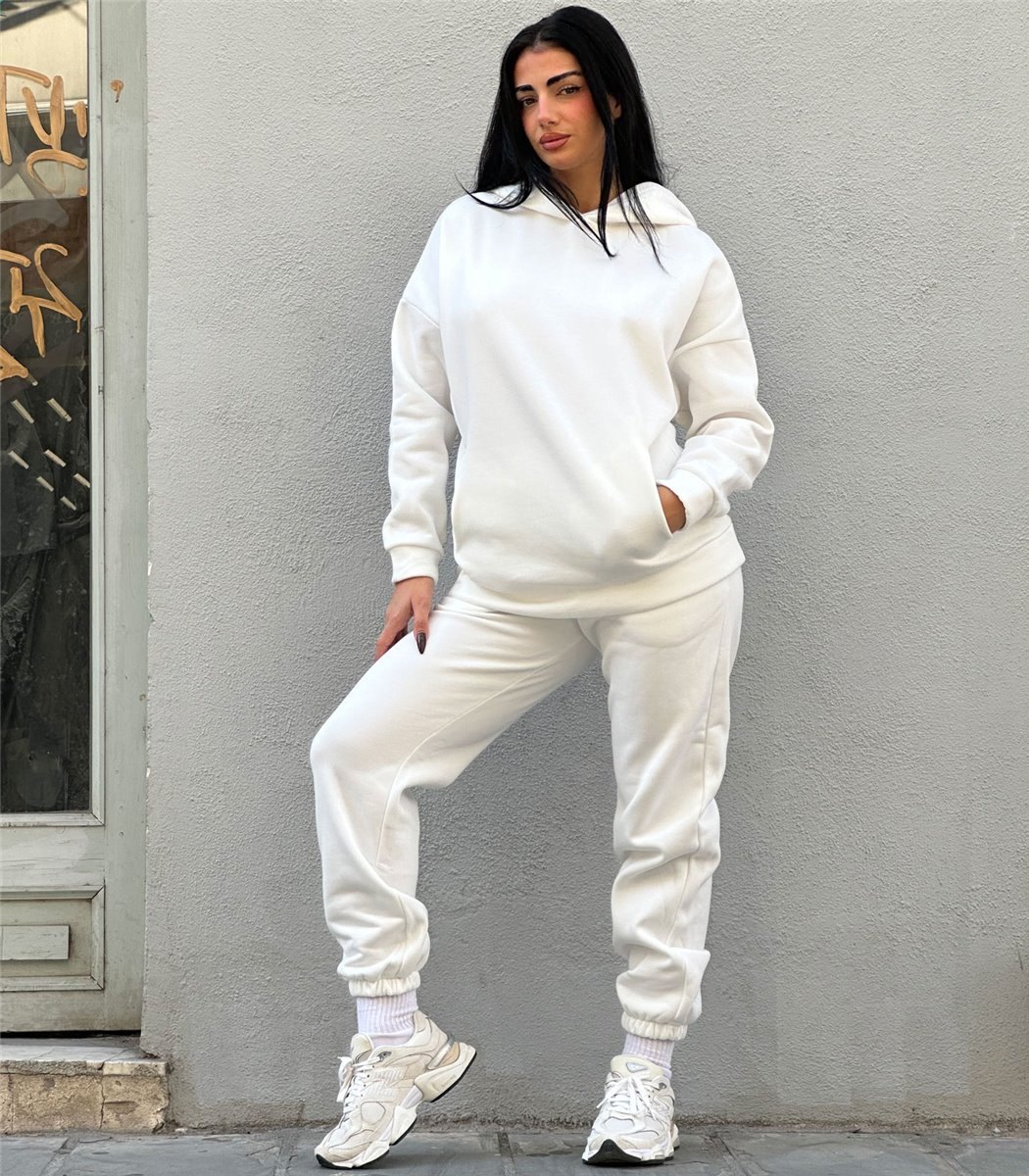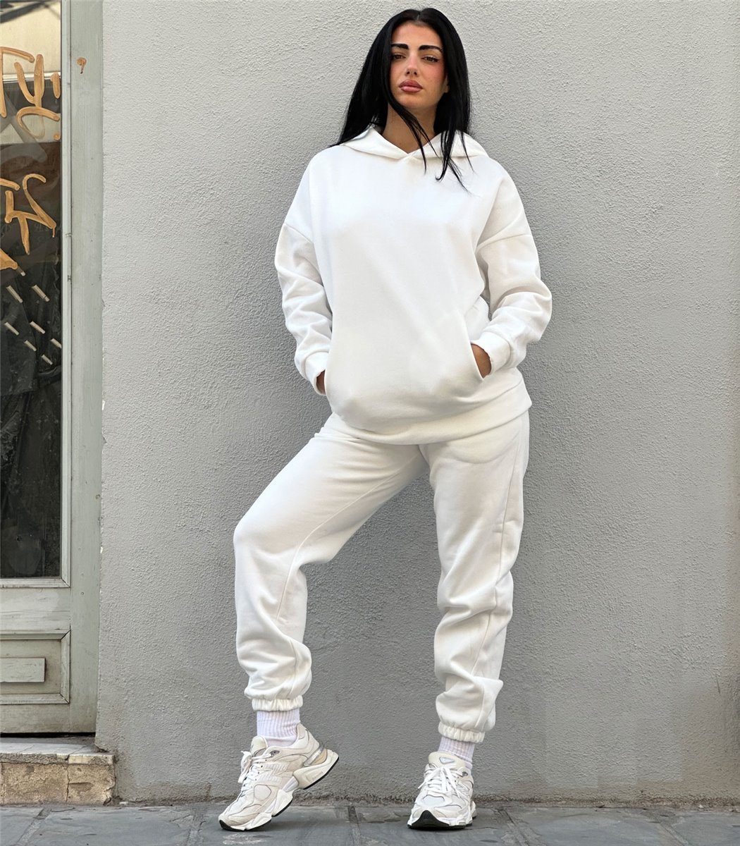 Λευκό σετ με μπλούζα με παντελόνι Catherine. Φούτερ μπλούζα με τσέπες και κουκούλα. Παντελόνι φόρμα ψηλόμεσο με λάστιχο στην μέση και στο τελείωμα.