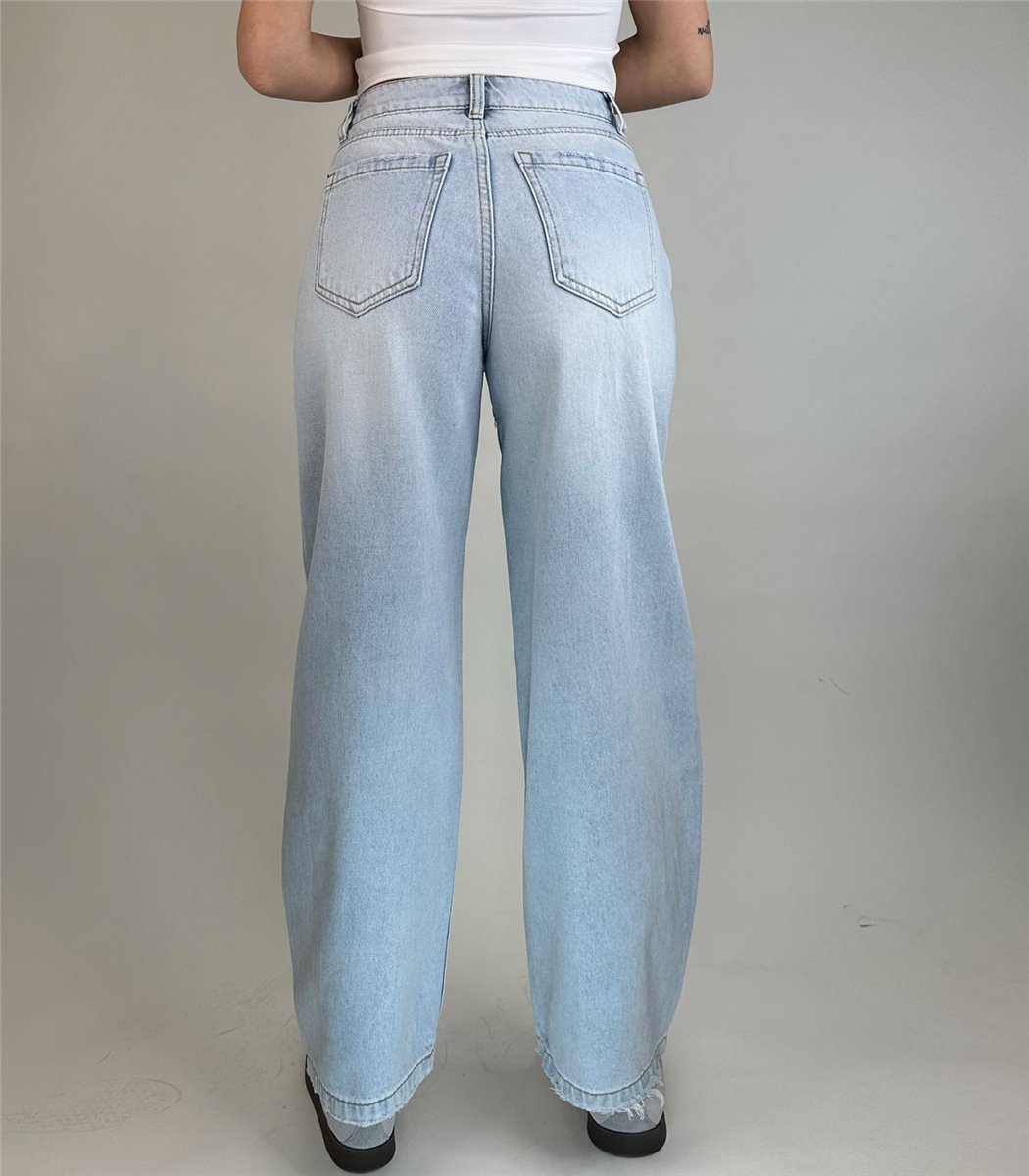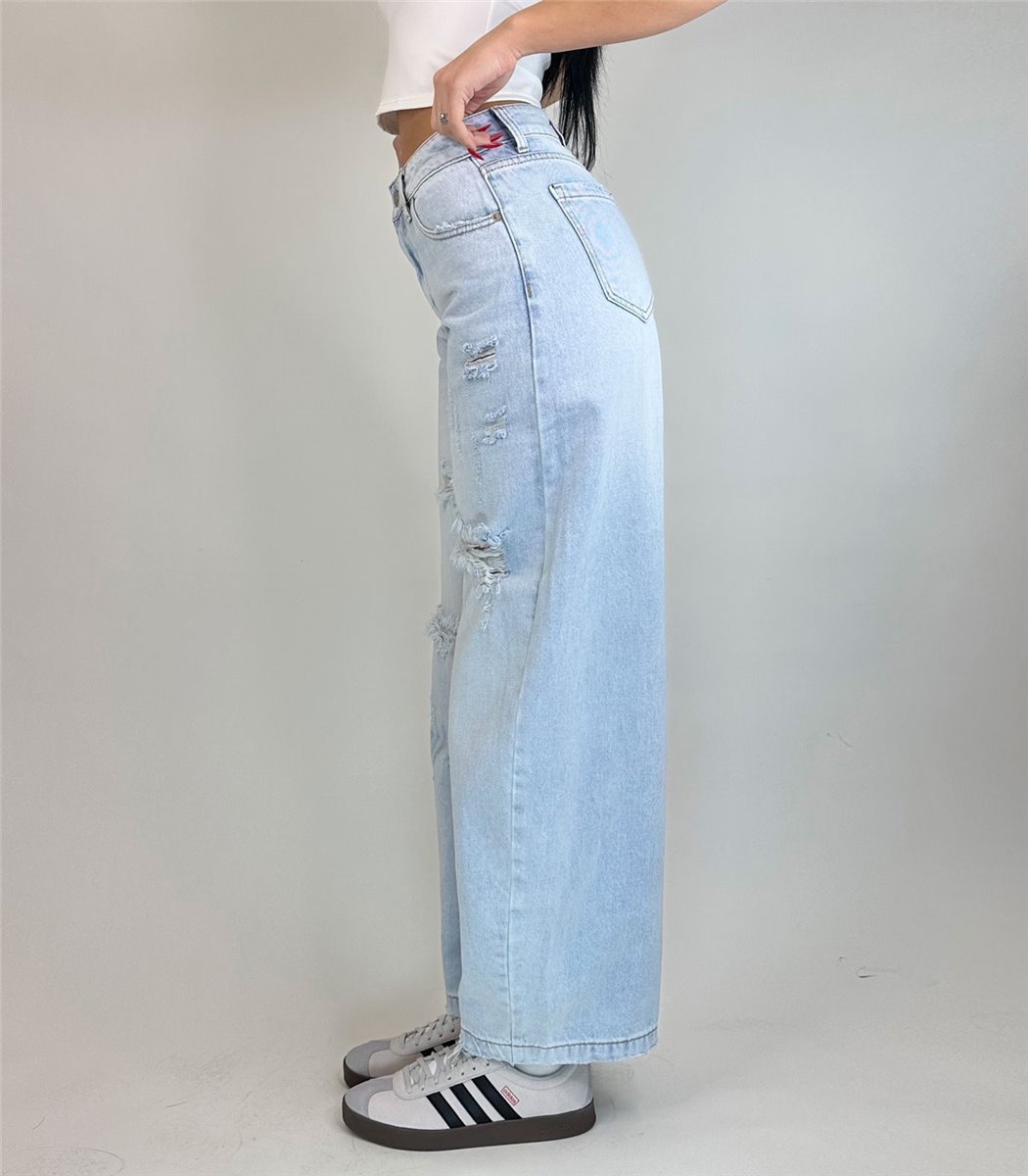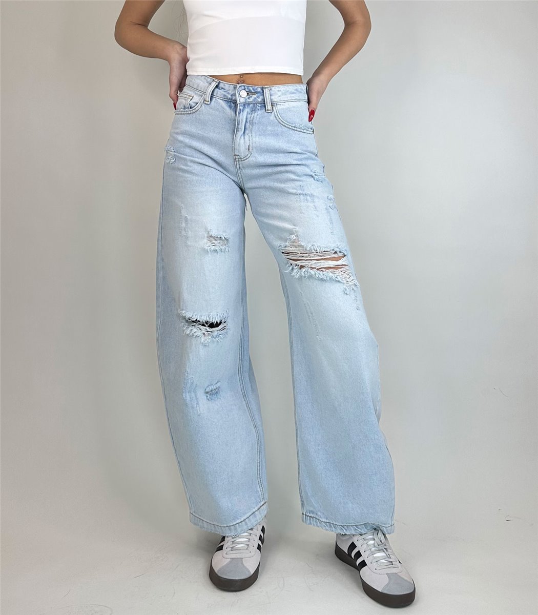 Μπλε ανοικτό τζιν mom fit ψηλόμεσο με σχισίματα σε σταθερό ύφασμα. Emma
